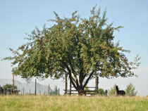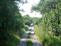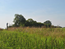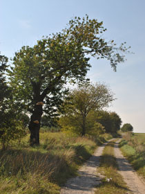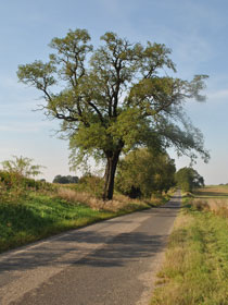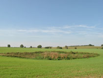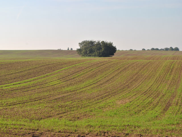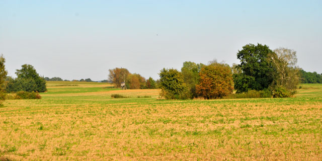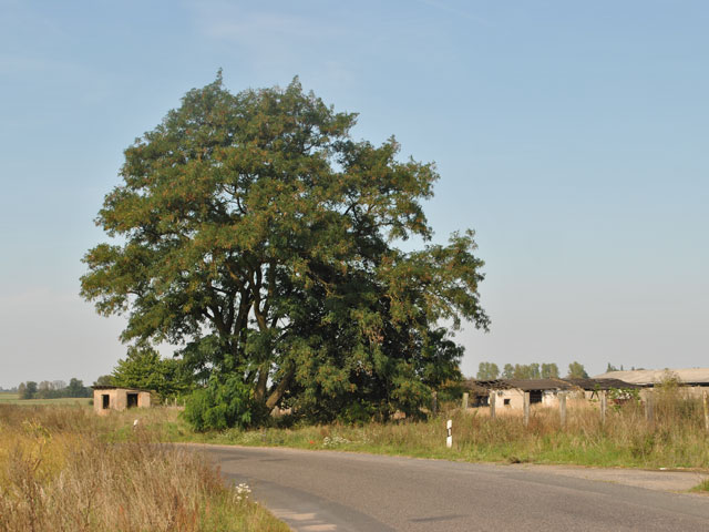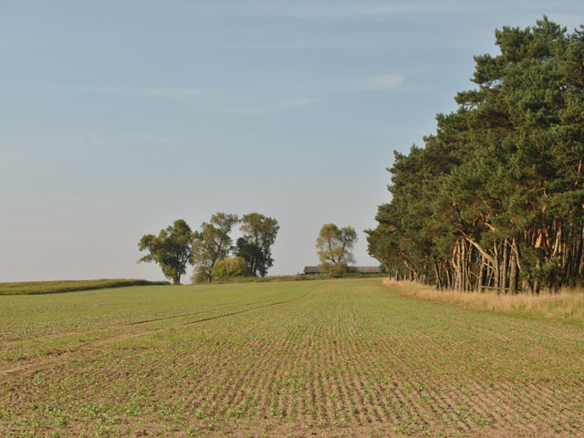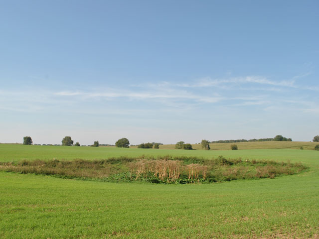 Schnell ist man an den Ruinen der LPG vorbei. Der Straßenname wechselt in „Tempelhofer Weg“, die Umgebung bleibt unverändert: leicht welliges Land mit Feldern und Wiesen, teilweise wie Schweizer Käse von Söllen durchsetzt. |