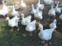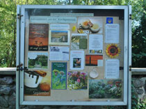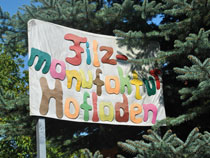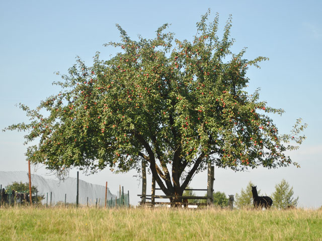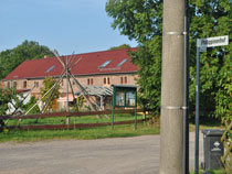 Am Ortseingang trifft man auf ein Gehöft, in dem man eine Ferienwohnungen mieten, aber auch Kunstwerke aus Filz bestaunen und kaufen kann. Ein großes Banner am Gartenzaun wirbt für die Filzmanufaktur und ihren Hofladen. |
