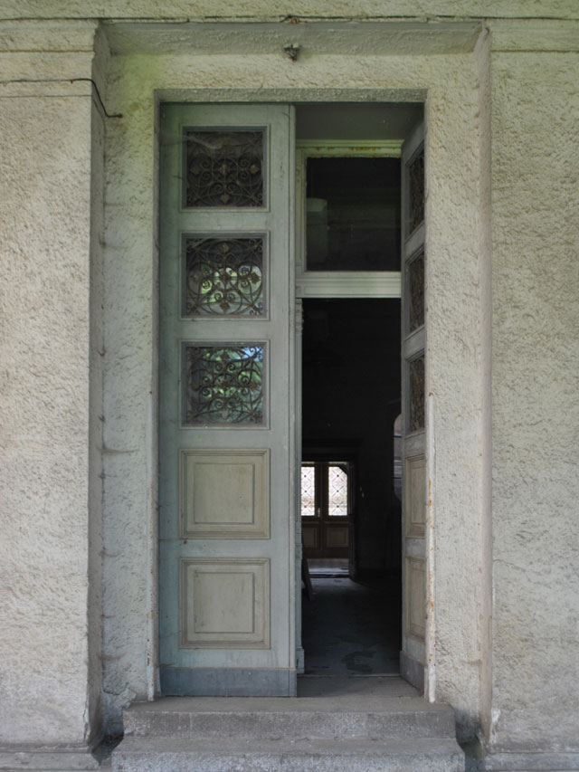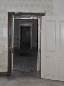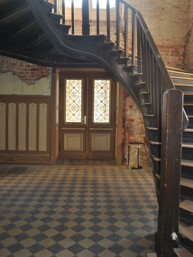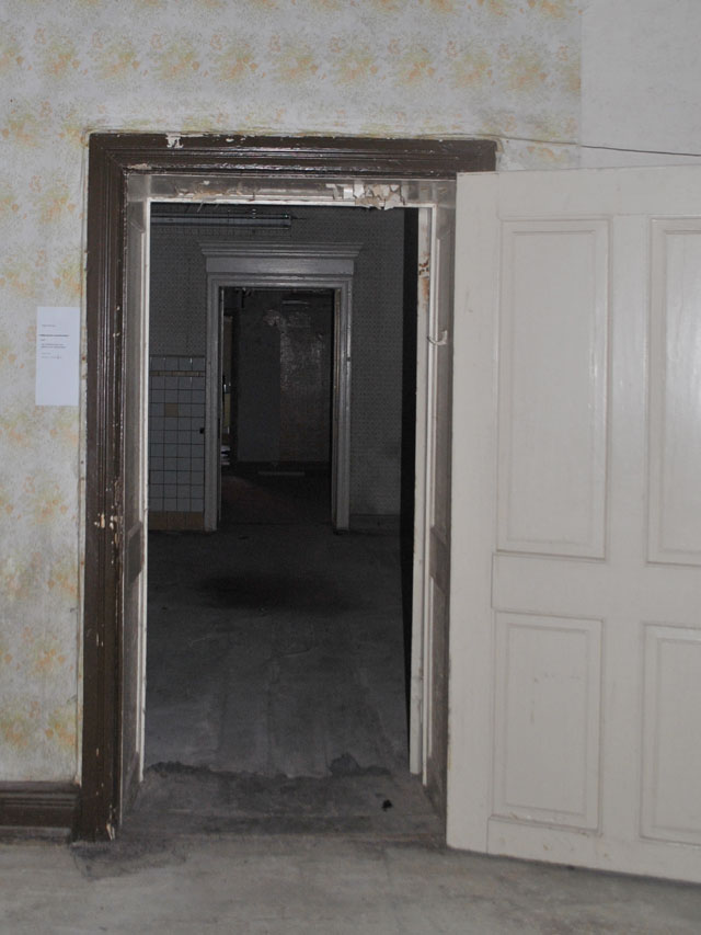 Dass hier ein paar Euro nicht ausreichen werden, wird einem schon im Erdgeschoss klar. Das sieht noch so aus, wie es die letzten Nutzer und nachfolgende Besucher hinterlassen haben. Kaputte Böden, provisorisch zugemauerte Öffnungen, grauenhafte Tapeten usw.