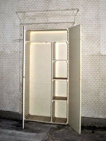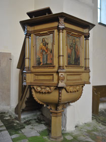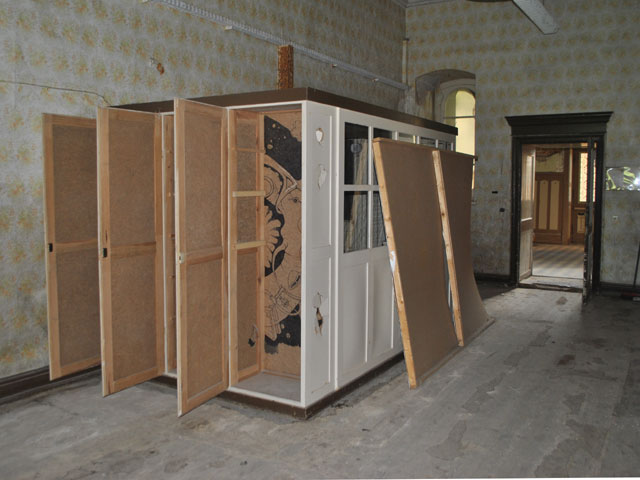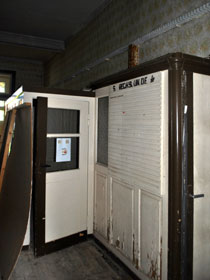 In dem großen Raum, in den man von hinten kommend zunächst tritt, steht ein Monstrum, das man für einen überdimensionierten Beichtstuhl halten könnte. Die Anordnung von Fenstern und Türen legt die Vermutung nahe, dass es sich um eine Pförtnerloge mit integriertem Besenschrank handelt.