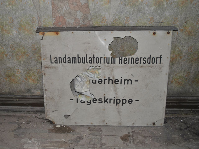 Ein an die Wand gelehntes Schild verrät, dass sich in diesem Haus das Landambulatorium Heinersdorf nebst Kinderheim und Tageskrippe befand. An der vermeintlichen Pförtnerloge findet sich zudem eine Stecktafel, deren inzwischen etwas durcheinander gekommene Überschrift mal „Sprechstunden“ lautete.
