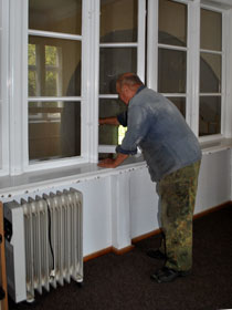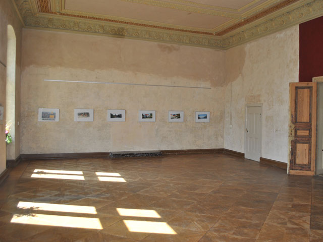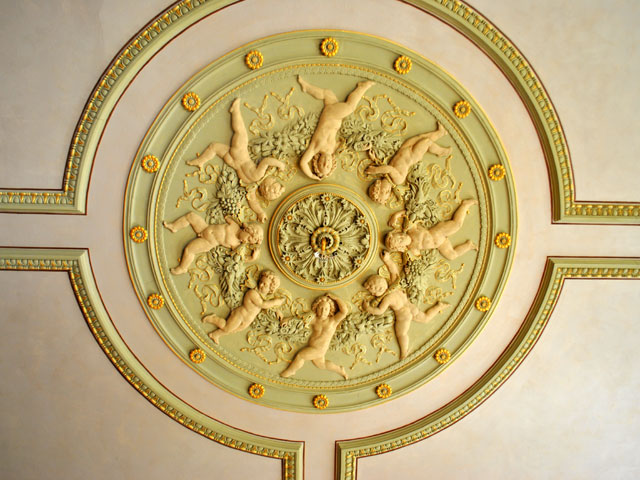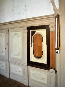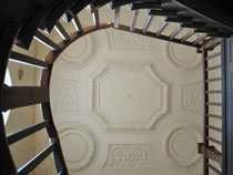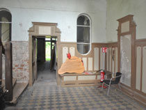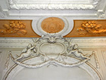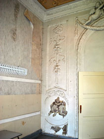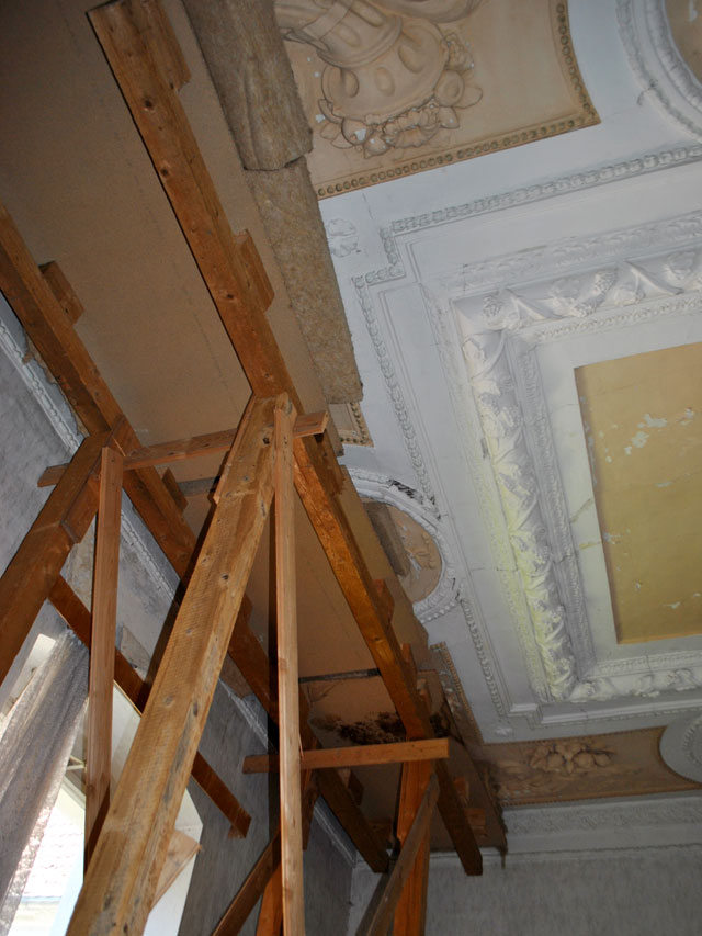 Ganz offensichtlich hat man sich nach der Sicherung der Bausubstanz und der Neudeckung des Daches zunächst daran gemacht, die Stuckdecken im zweiten Stock zu sichern und zu restaurieren. Damit ist man schon ziemlich weit gekommen.