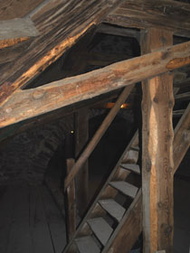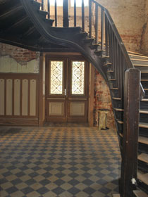Die geschwungene Holztreppe macht einen brauchbaren Eindruck und ist auch noch nicht ausgetreten.