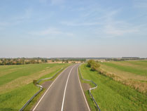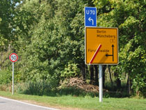 Zunächst geht noch über die für Freitag nachmittag unwirklich leere B1/B5, die hier auf einer Umgehungsstraße einen weiten Bogen um Müncheberg macht. Eigentlich läuft hier nahezu jeglicher Verkehr zwischen Berlin und Küstrin (B1) und Frankfurt (B5) einschließlich der Schnaps-, Benzin- und Zigaretten-Touristen durch, aber heute ist keiner unterwegs. |