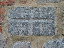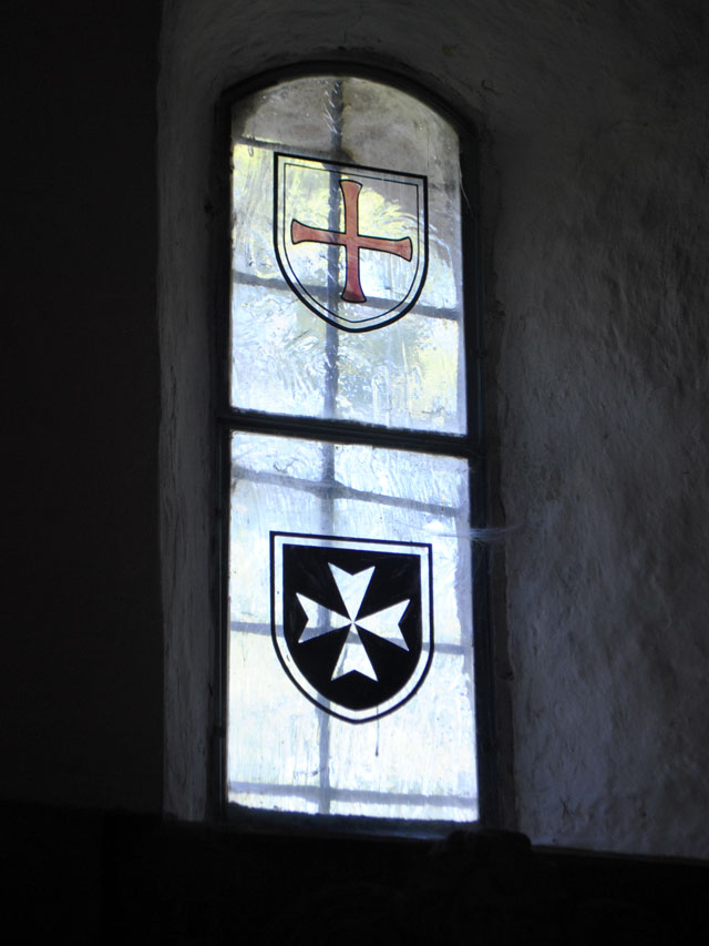 Neben einer vermauerten Priesterpforte findet man auf der Südseite als Zeichen der Templer ein in den Feldstein gemeißeltes Jerusalemer Kreuz: Ein großes, allseits symmetrisches Kreuz mit vier kleinen Kreuzen in den Quadranten. Das war das Wappen des Königreiches Jerusalem und verweist darauf, dass die Templer aus dem Heiligen Land stammen.