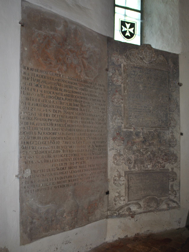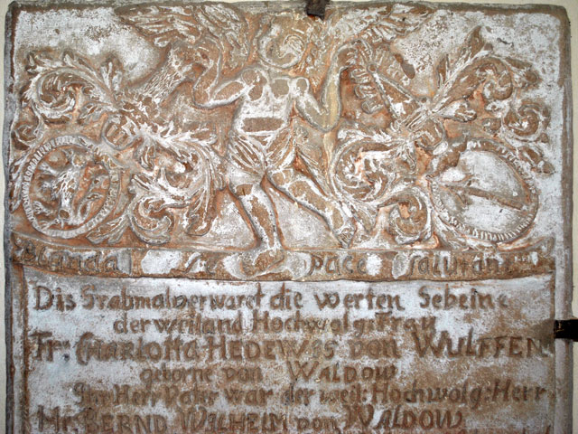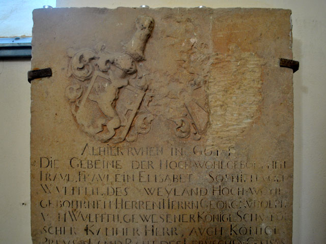 Alhier ruhen in Gott die Gebeine der hochwohlgebornen Frau, Fraulein Elisbet Sophien von W. Wittin des weyland hoch-wohlgebornen Herrn Georg Rudolph von Wulffen, gewesener königl. Schwedischer Kammerherr, auch Preuss. Landrath des Lebuschen Creises ... Dis Grabmal verwaret die werten Gebeine der weiland hochwohlgeb. Frau Fr. Charlotta Hedewig von Wulffen geborne von Waldow ... |
