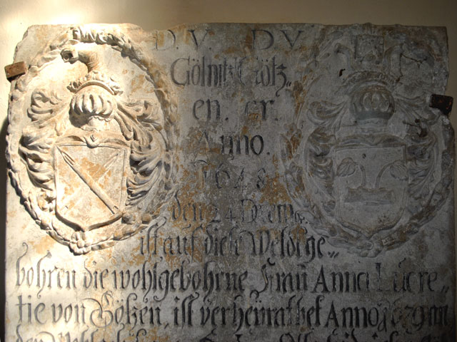 Anno 1648, den 24. Decbr. ist auf diese Weldt gebohren die wohlgebohrne Frau Anna Lucretie von Göltzen, ist verheirathet Anno 1679