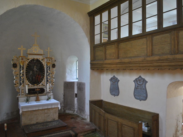 Eine Besonderheit im Innern ist die große, verglaste Patronatsloge, die aus dem Obergeschoss des Sakristei-Anbaus den Blick in die Kirche freigibt. Auffällig sind außerdem die Johanniterkreuze (auch als Malteserkreuze bekannt), die auf die früheren Besitzer der Kirche verweisen.