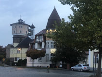 Gegenüber der Kirche fällt das auch unter Denkmalschutz stehende evangelische Pfarrhaus auf. (unten rechts) |