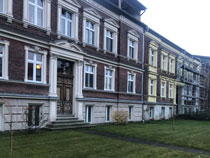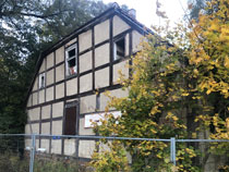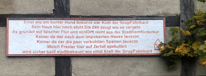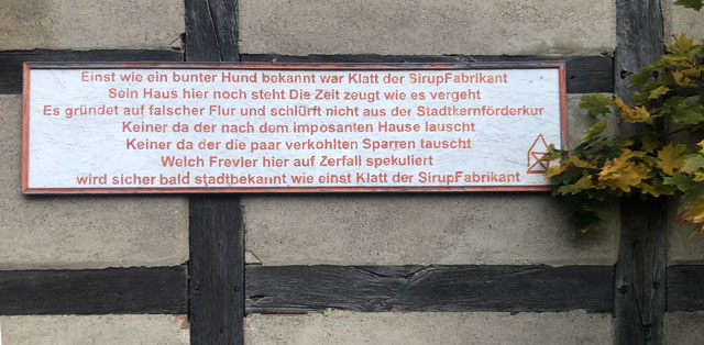 Auf der rechten Straßenseite wartet das Haus des Sirupfabrikanten Klatt darauf, zum Denkmal erhoben oder zumindest restauriert und dauerhaft erhalten zu werden. Aber es scheint dem Verfall preisgegeben, worauf eine Gruppe von Häuserrettern mit einem Schild an der Fassade hinweist: "Einst wie ein bunter Hund bekannt war Klatt der SirupFabrikant. Sein Haus hier noch steht. Die Zeit zeugt wie es vergeht. Es gründet auf falscher Flur und schlürft nicht aus der Stadtkernförderkur. Keiner da, der nach dem imposanten Hause lauscht. Keiner da, der die paar verkohlten Sparren tauscht. Welch Frevler hier auf Zerfall spekuliert, wird sicher bald stadtbekannt wie einst Klatt der SirupFabrikant." |