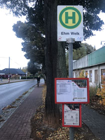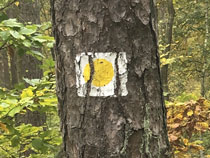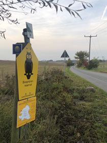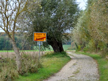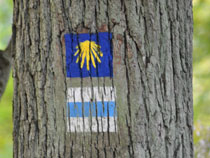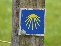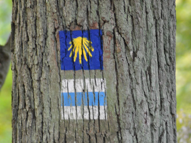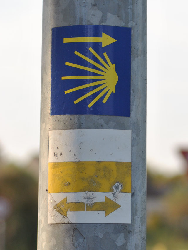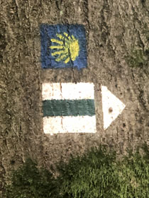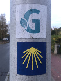 Inzwischen bin ich auf einem Weg, der mit einem gelben Punkt gekennzeichnet ist. Der trifft irgendwann auf einen asphaltieren Weg, auf dem der aus Sandkrug kommende Jakobsweg verläuft und hier in meinen Weg einbiegt. | ![]() |
