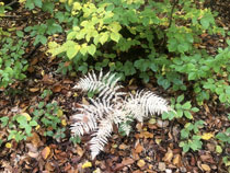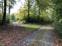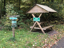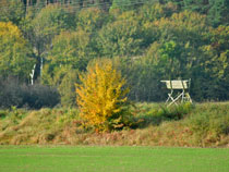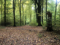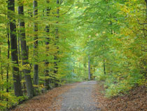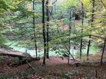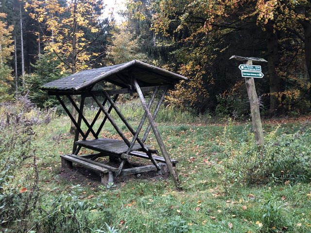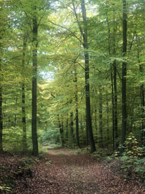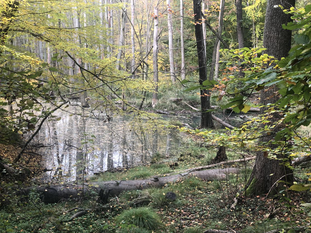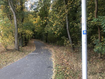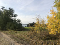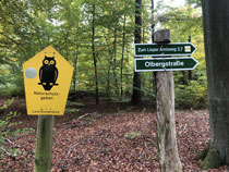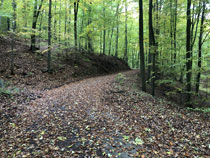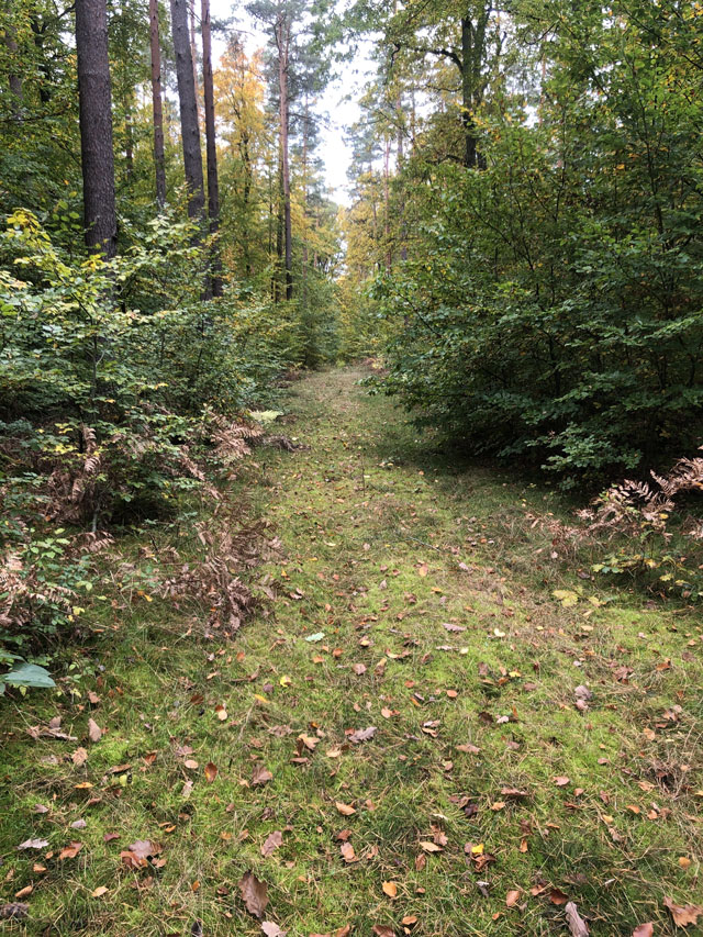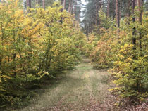 Der Weg führt jetzt ziemlich naturbelasssen durch einen Kiefernwald, der zum Mischwald umgewandelt wird. Die Laubbäume, deren Blätter zum Teil schon gelb und braun sind, machen den Weg zum farbigen Erlebnis. |