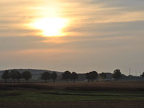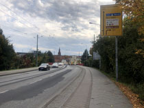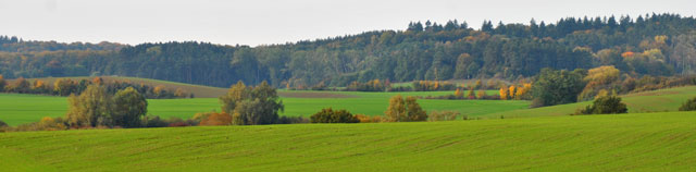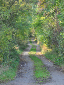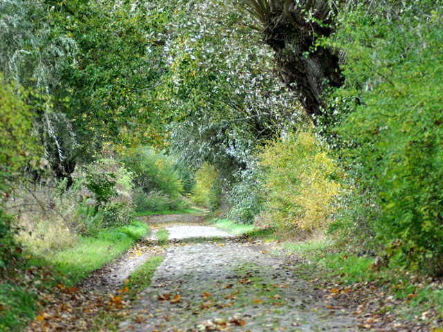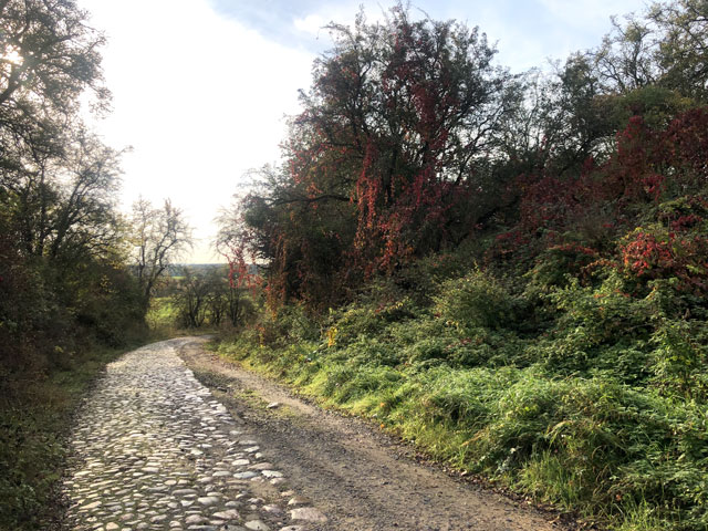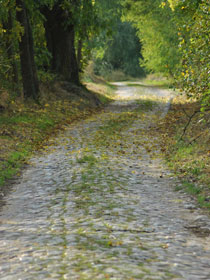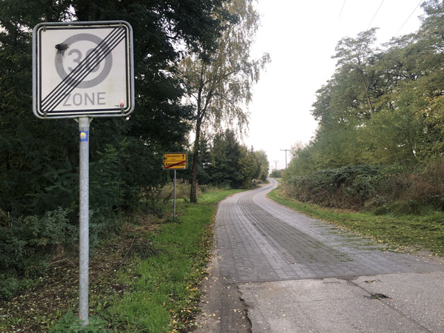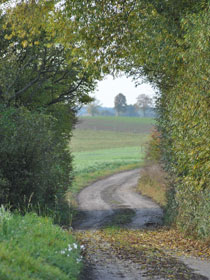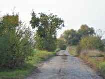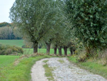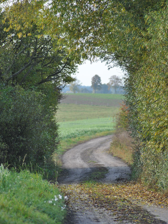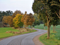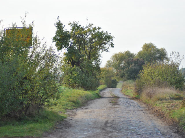 Aus Schmargendorf hinaus geht es auf einem mit Kopfsteinen gepflasterten Weg, der über weite Felder führt und nur streckenweise mit Bäumen bestanden ist. | ![]() |