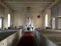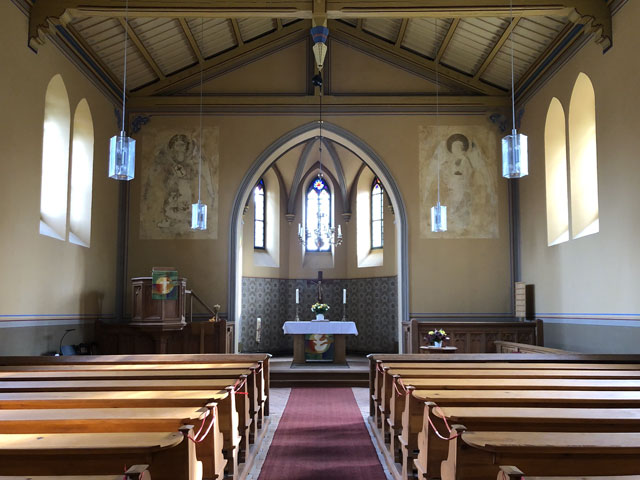 Abgesehen vom Kanzelaltar, bei dem die Kanzel dominiert, ist die in Grautönen gehaltene Kirche sehr schlicht.