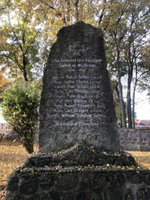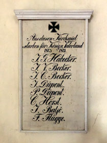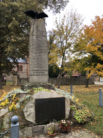 Vor der Kirche steht ein Gedenkstein für die Toten und Vermissten des Ersten Weltkrieges, die namentlich genannt sind. Zwei der Genannten haben einen französichen Namen. |