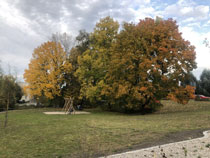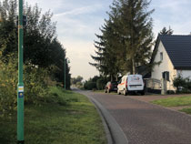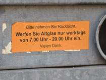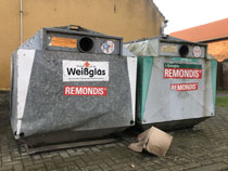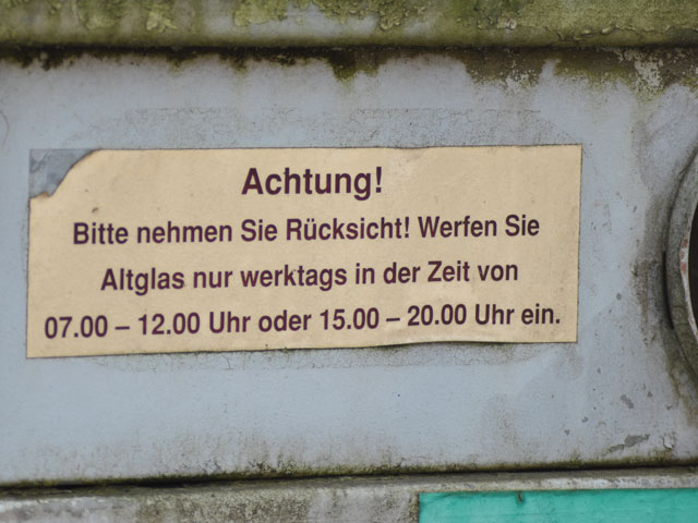 An den Anger schließt sich das Dorfgemeinschaftshaus (obern rechts) an. Da dort sicher auch immer mal gefeiert wird, stehen gleich nebenan die Glascontainer. So wie es Leute gibt, die kein Bier aus grünen Flaschen trinken, gibt es offenbar auch welche, die glauben, dass weiße und grüne Flaschen beim Zerschellen unterschiedliche Geräusche machen. Deshalb darf man während der Mittagspause nur Weißglas, aber kein Grünglas einwerfen. |