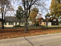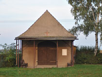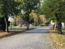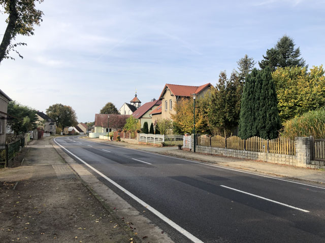Die mit Betonsteinen gepflasterte und mit jungen Bäumen bestandene Straße, auf der ich laufe, führt vorbei am Friedhof mit einer sehr bescheidenen Kapelle und gabelt sich am Anger, der eigentlich eher ein Straßendreieck ist.