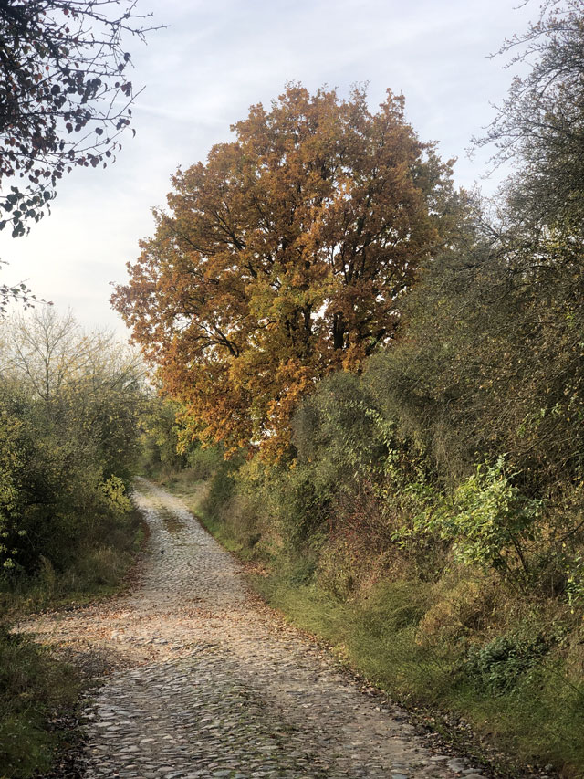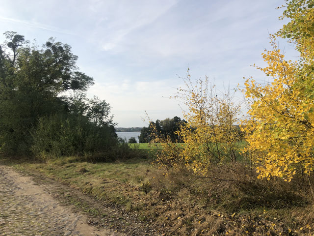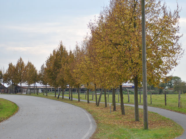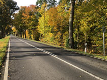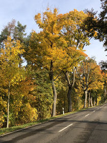 Nun muss man leider etwa einen Kilometer ohne Fußweg an der L200 entlanglaufen. Das ist nicht schön, aber es ist kaum Verkehr und die Bäume am Straßenrand, die langsam Farbe bekommen, entschädigen mich für dieses Wegstück. |