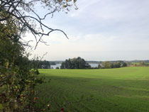 Der Weg führt durch ein weite, saftig grüne Landschaft mit dunklem Wald im Hintergrund. Er führt vorbei am malerischen Serwester See, der gelegentlich ins Blickfeld rückt. |