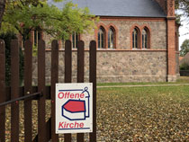 Die Serwester Dorfkirche, die rechts am Straßenrand auf einer kleinen Anhöhe steht, ist ein echtes Schmuckstück. | ![]() |