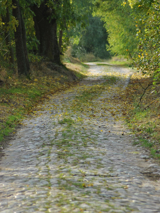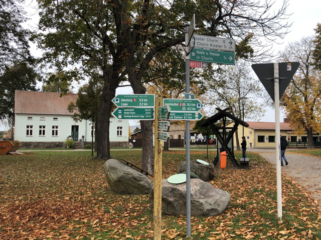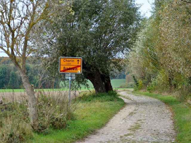 Jener, der den Jakobsweg nach Chorin betrifft, zeigt in eine rechts abzweigende, von alten Bäumen beschattete Kopfsteinstraße. |