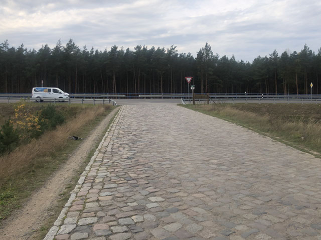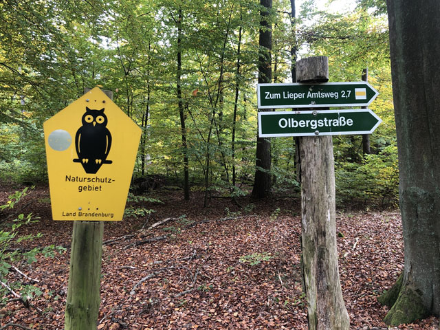 Der ebenfalls gepflasterte, aber offenbar wenig begangene Weg führt zum Lieper Amtsweg, der von Sandkrug nahe Chorin nach Liepe am Oder-Havel-Kanal führt. | ![]() |