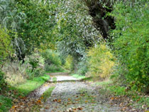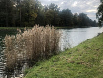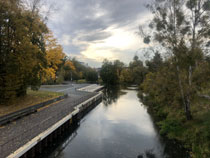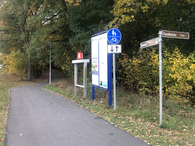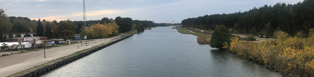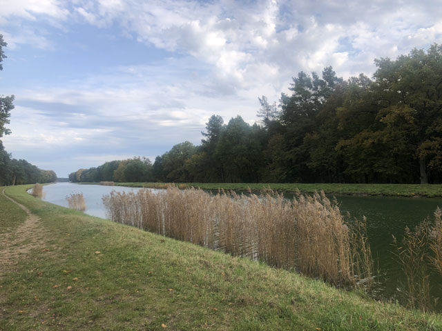 Der Weg biegt nach rechts ab und führt allmählich seitlich den Damm hinauf, wobei er die Ragöse überquert, die den Damm an seiner Sohle unterquert und ihm seinen Namen gegeben hat. Oben angekommen bietet sich in beiden Richtungen ein guter Blick auf den Kanal, dessen Ufer hier ohne jede Bebauung sind. Auf einem Weg, der nur durch ein paar Bäume und Sträucher vom Wasser getrennt ist, geht es bis zur nächsten Brücke. |