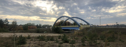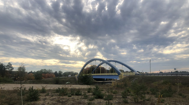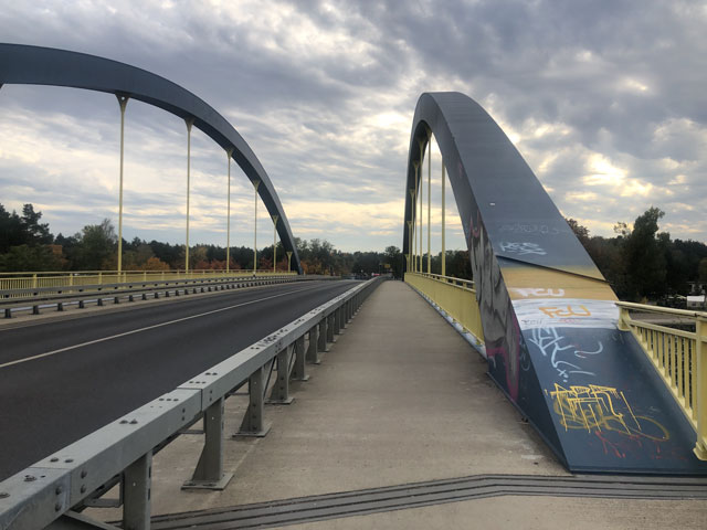 Auf dem letzten Stück führt dieser nunmehr gepflasterte Weg hinauf zur Angermünder Chaussee (L200), die auf der Bogenbrücke den Oder-Havel-Kanal überquert. An der Straße angekommen, erweist es sich als ziemlich schwierig, im Feierabendverkehr eine Autolücke abzupassen, in der man den Fußweg auf der anderen Straßenseite erreichen kann. |