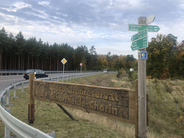 Die Straße führt bald in den Wald hinein, der im Westen bis weit hinter Chorin und im Süden bis Eberswalde reicht.