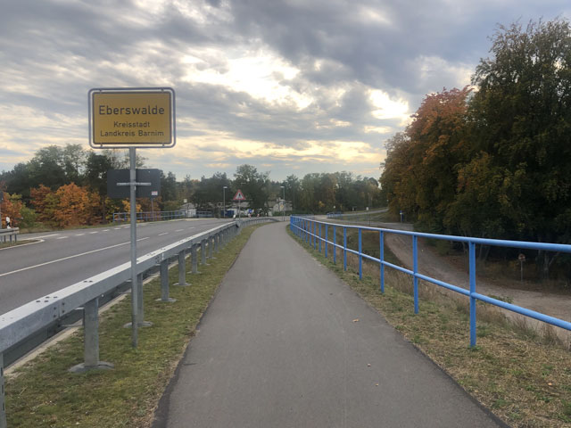 Unmittelbar hinter der Brücke beginnt Eberswalde, die Kreisstadt des Barnim.