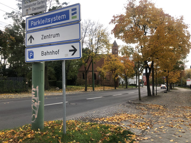 Kurz vor der Hospitalkapelle St. Georg an der Breiten Straße biegt der Jakobsweg eigentlich links in eine Kleingartenanlage, und später nach rechts zum Finowkanal, an dessen Ufer er in die Innenstadt führt. | ![]() |