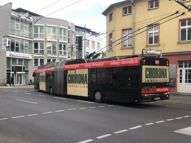 Der Bus bekommt zudem seinen Kraftstoff nicht aus dem Tank, sondernd aus den „Strippen“, die über der Straße gespannt sind, weshalb man ihn auch „Strippenbus“ nennt. Der verkehrt hier, im ältesten deutschen Obusnetz, schon seit 1940. Heute fahren in Deutschland außer hier nur noch in Esslingen und Solingen Oberleitungsbusse.