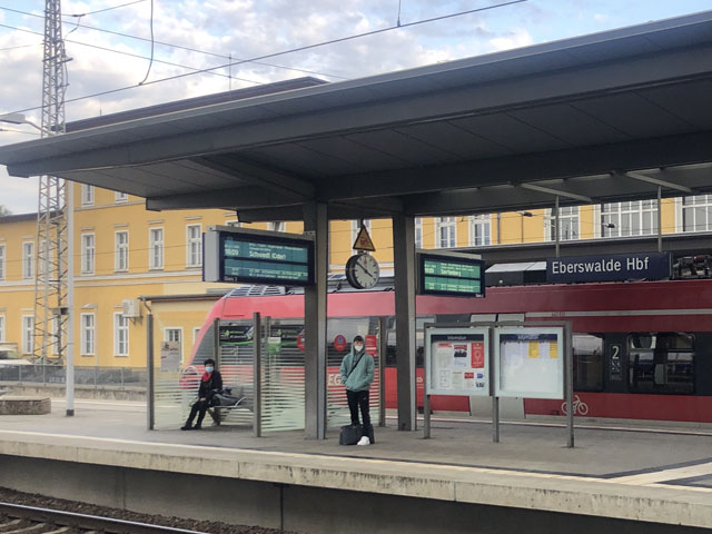 An der Alten Brauerei ist nur Zeit für einen kurzen Blickkontakt und am Eberswalder Bahnhof angekommen, ist gerade noch Zeit, einen Fahrschein zu erwerben, dann kommt auch schon der RE3, der mich nach Bernau bringt. Es war ein schöner Tag mit einer trotz Abkürzungen recht langen, aber sehr abwechslungsreichen Tour. In ein paar Tagen werde ich zusammen mit anderen noch einmal den Jakobsweg von Angermünde nach Eberswalde laufen, dann aber entlang des Grumsiner Forstes, mit einer Übernachtung in Groß Ziethen und mit einem Pilgertreffen im Kloster Chorin. Darauf freue ich mich jetzt schon sehr. |