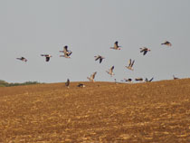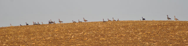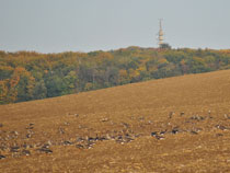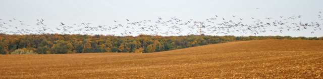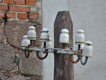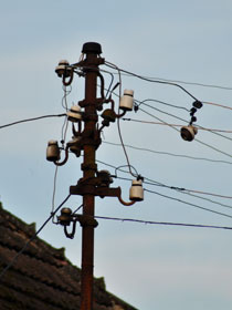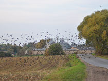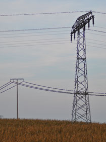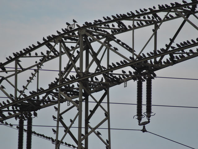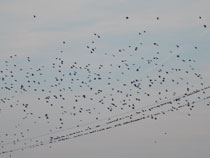 Auf halber Strecke zwischen Angermünde und Schmargendorf kreuzt der Weg eine Freileitung, die auf den ersten Blick aussieht, als wären hier besonders dicke Kabel gespannt worden. Beim näheren Hinsehen zeigt sich aber, dass die Leitungen fast lückenlos mit Staren besetzt sind. |