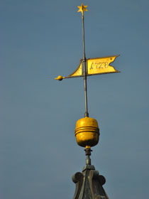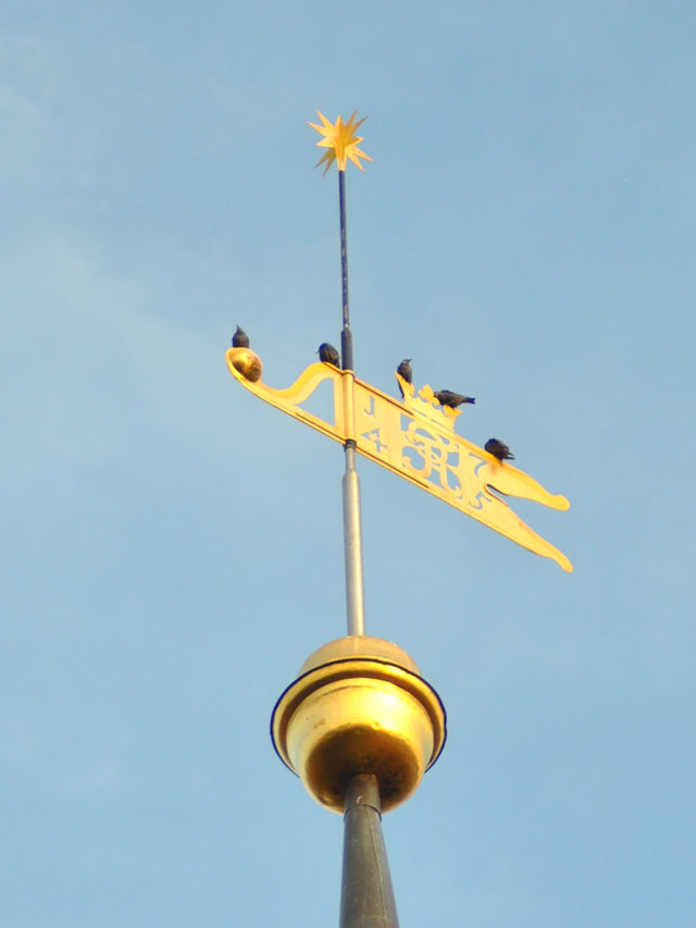 Die Wetterfahne auf dem Kirchturm trägt die Jahreszahl der Errichtung des Turmes (1745) und die Initialen FR für den seinerzeitigen König, Fridericus Rex - das war der Alte Fritz. |