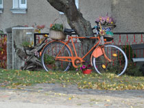 Wie im richtigen Leben ist auch hier nicht jeder Weg gerade - die letzten Meter vor Klein Ziethen verlaufen in Schlängellinien. Im Ort wird man von alten Landwirtschaftsgeräten und Blumenkübeln begrüßt. Das freut das Herz und die Augen. |
