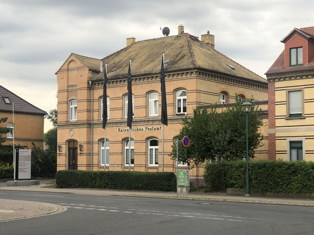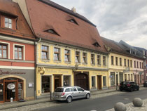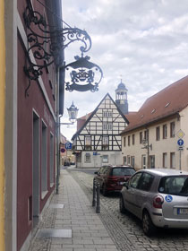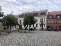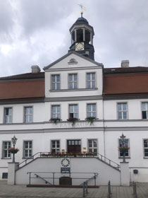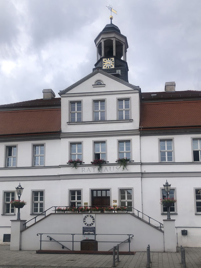 Es war heute früh schon nach acht, als ich aus der Herberge raus war. Nun noch schnell zu Penny oder REWE (beide Wand an Wand, 200 Meter weiter ein Netto, sonst nichts in der Stadt), um Verpflegung für den Tag zu fassen. Dann noch ein paar Schritte durch die Altstadt. Vor dem Rathaus kam mir die Idee, dort mal nach einem Pilgerstempel zu fragen. Obwohl das Rathaus mittwochs geschlossen ist, hat sich die Dame am Empfang mein Ansinnen angehört und im Haus herum telefoniert, wer mit meinem sehnsuchtsvollen Verlangen etwas anfangen kann. Kurz darauf kam eine Angestellte die Treppe runter und erklärte mir, dass sie mir leider nur einen Rathausstempel geben könne, dass es aber in der Touristeninfo einen Pilgerstempel gibt. Da diese aber auch mittwochs geschlossen ist, hat sich die Dame am Empfang hingesetzt und dort angerufen, dass man mich doch einlassen möge. Dann kam noch eine Kollegin dazu, die sich anbot, mich hinzuführen, weil sie selbst ins benachbarte Museum müsse. Mit solchem Geleit bin ich da sofort eingelassen worden und durfte dann sogar zwischen zwei Stempeln wählen - ich habe sie mir beide in den Pilgerpass drücken lassen, schließlich fehlt mir ja einer von Kemberg.