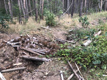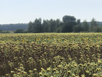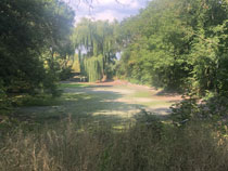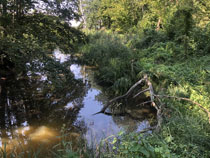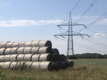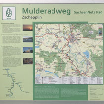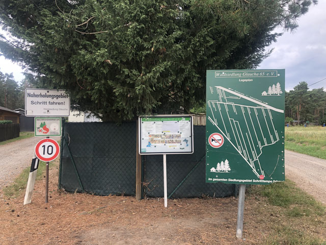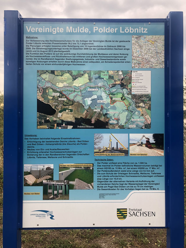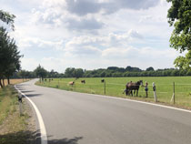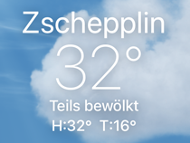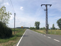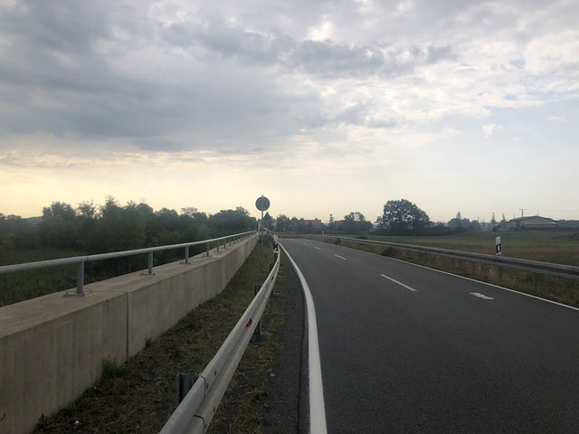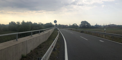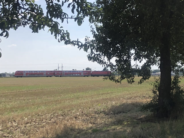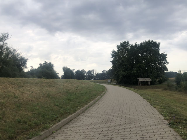 Zum Weg wäre zu sagen, dass der nur ein paar Kilometer durch Wald führte, ansonsten auf Feldwegen oder am Straßenrand. Hinter Krippehna war es besonders schlimm, da stand kein Baum oder Strauch an der Straße und nur die Freileitungsdrähte warfen Schatten, der aber zur Abkühlung nicht ausreichte. Trotz Wolken waren inzwischen 32 Grad.