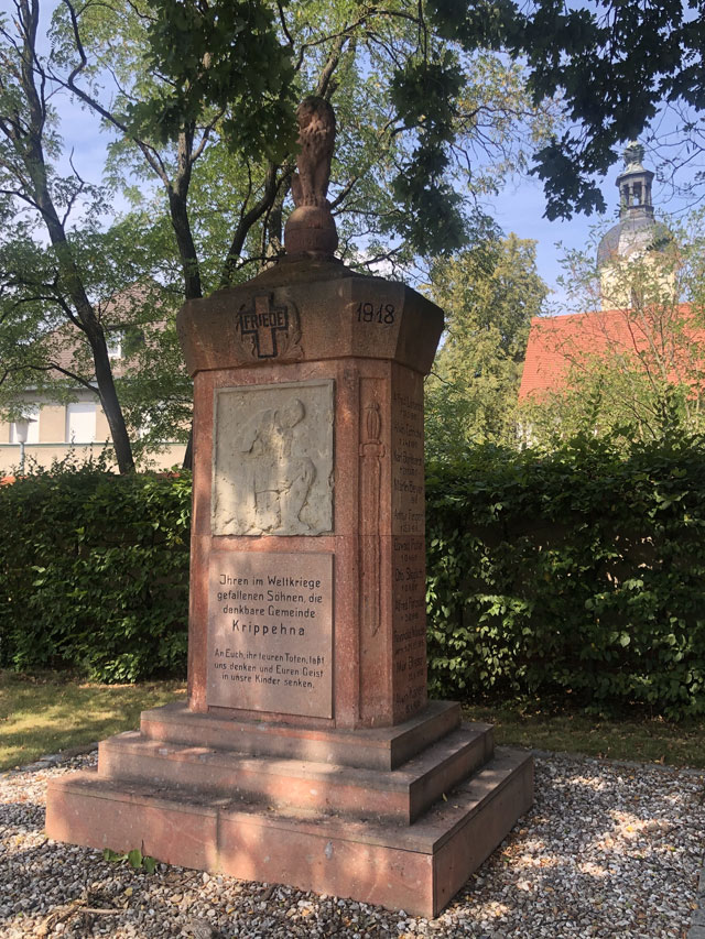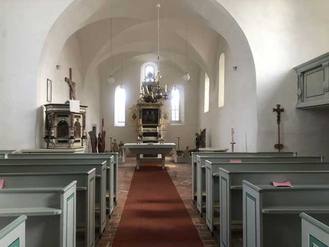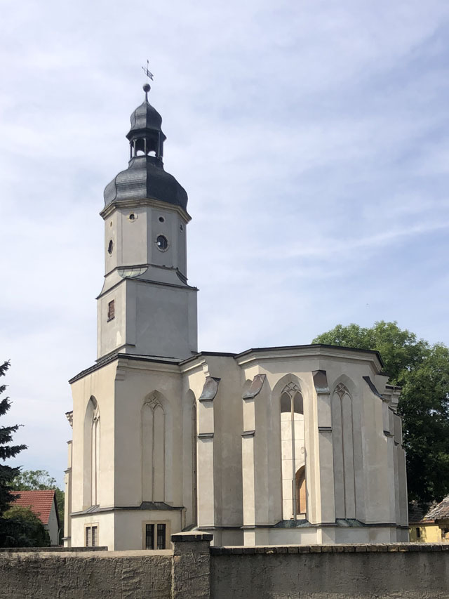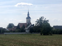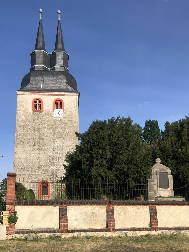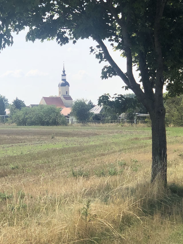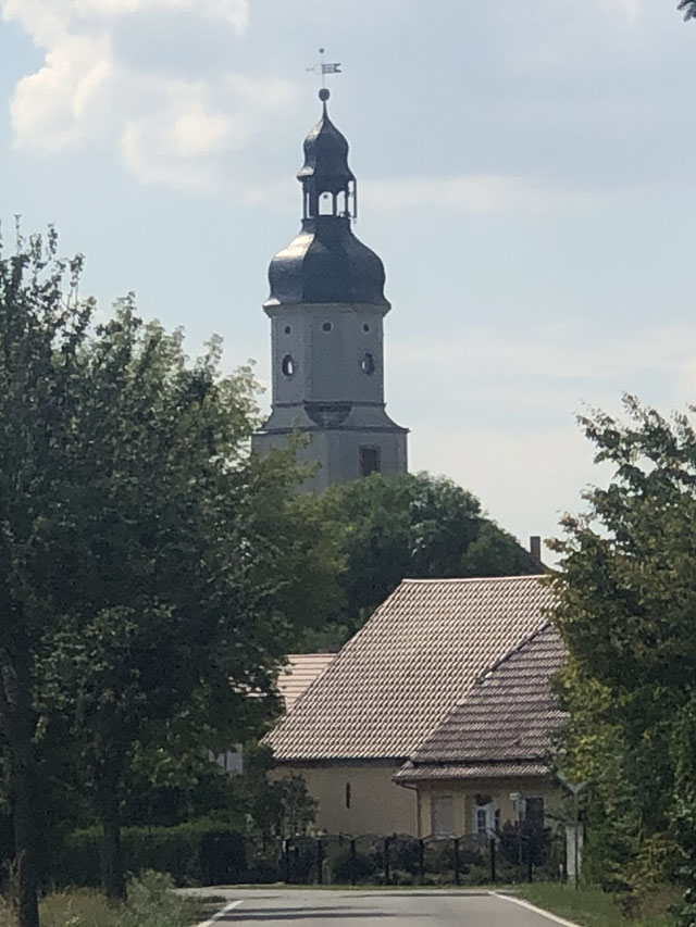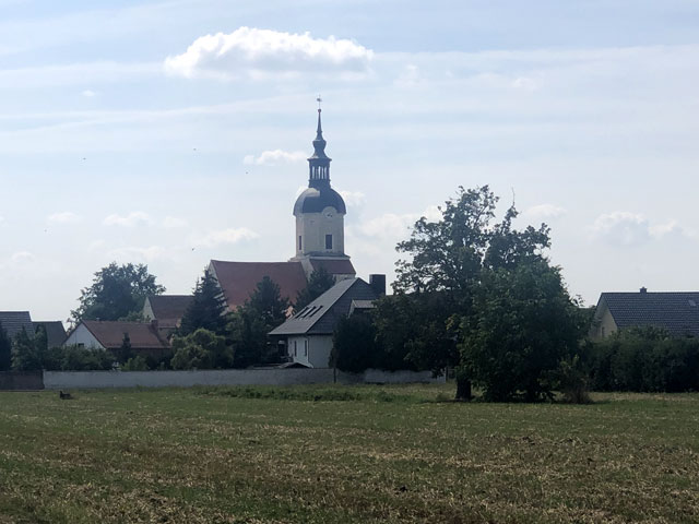 Später habe ich dann noch in einer Kirche eine nette Begegnung gehabt. In Krippehna war ich gerade von einem kurzen Schlummerchen auf einer Friedhofsbank erwacht, als ein Herr in meinem Alter die Kirche aufschloss, um im Turm die Uhr zu stellen, was nach seiner Auskunft jede Woche einmal nötig ist, weil Temperatur und Wind den Gang der Uhr beeinflussen. Obwohl mich das Justieren brennend interessiert hätte, bin ich den Herrn nicht auf den Turm gefolgt, da ich von den inzwischen zurückgelegten Kilometern schon ziemlich geschlaucht war. Ich habe mir aber die Kirche angeschaut, die mit einer gerade sehr kostspielig restaurierten Orgel aufwarten kann. Es gab da auch einen schönen Altar zu bestaunen und viele tönerne Figuren, die aus den Händen einer früheren Pfarrersfrau stammen. Die umlaufende Empore war nach der Schilderung des Herrn früher sogar mal zweistöckig. Jetzt gibt es sonntags 10…20 Besucher, da kommt man mit weniger Plätzen aus. Als wir aufs Wandern/Pilgern kamen, erzählte er, dass er oft mit seiner Frau nach Österreich in die Berge fährt, aber dass seine Frau immer davon träumt, auf den Jakobsweg zu gehen, wenn sie Rentnerin ist. Da konnte ich doch gleich eine Literaturempfehlung loswerden.