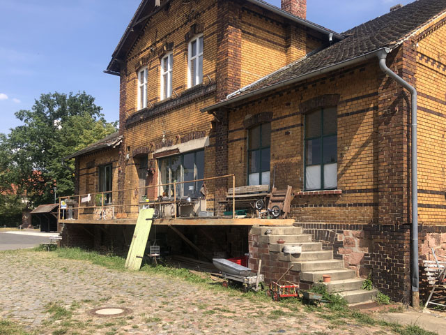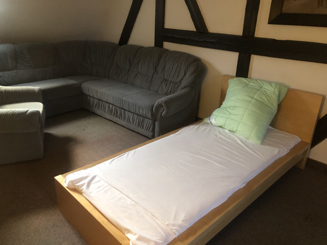 Er hat mir dann noch das ganze Haus gezeigt und erzählt, dass das Quergebäude mit viel Fachwerk und einem Laubengang auch Wander-/Pilgerherberge werden soll. Angeblich wird die Herberge ziemlich gut genutzt, schließlich liegt sie nicht nur direkt am Luther- und Jakobsweg, sondern auch am Radweg Berlin-Leipzig, der gut befahren ist.