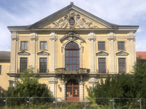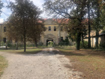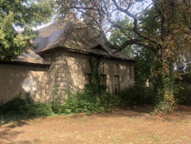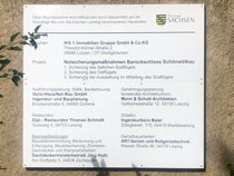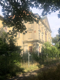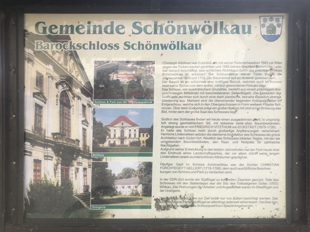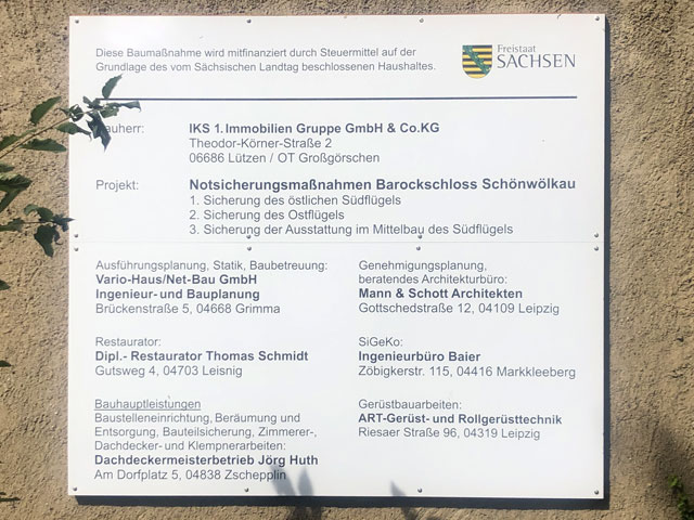 Einen noch viel trostloseren Eindruck macht gegenüber das ehemalige Gut Wölkau und insbesondere das große, mehrflügelige Schloss auf dem Gutsgelände, das von einem Bauzaun umgeben ist. Das Dach ist glücklicherweise neu gedeckt, aber das zwischenzeitlich schon mal ganz ordentlich hergerichtete Hauptportal im Südflügel sieht schon wieder ziemlich schlimm aus und alles andere gleicht eher einer Ruine, als einem in Sanierung befindlichen Schloss.