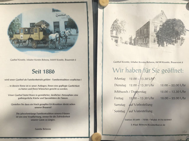 In Krostitz führt der Jakobsweg direkt an der Brauerei vorbei, aber man darf nicht glauben, dass man vor Ort an einen Tropfen Ur-Krostitzer gelangt. Der „Fanshop“ ist vom Brauereigelände in einen der beiden Supermärkte verlegt worden. Und sonst gibt es für Fremde nur Stapel von Bierkisten zu sehen. Kurz vor der Brauerei ist eine Kneipe am Rand eines Sportplatzes, aber die hat wohl nur zu Spielen geöffnet. Die Kneipe gleich nach der Brauerei wirbt mit jahrzehntelangem Familienbetrieb, hat aber mittwochs nur von 12 bis 13.30 Uhr offen. Da muss man schon sehr punktgenau trinken. Fakt ist, dass ich in den 26 km bis zur Herberge auf keine geöffnete Verkaufs- oder Verpflegungsstelle getroffen bin. Und auch im Zentrum von Krostitz scheint es nichts zu geben, denn man wird stets auf die zwei Kaufhallen und den Griechen verwiesen, sämtlich an der B2 gelegen, also ziemlich weit weg von hier.