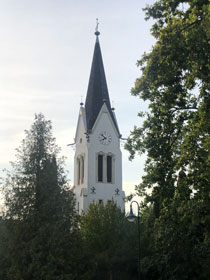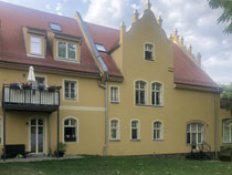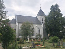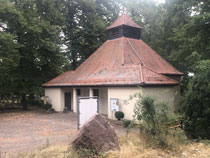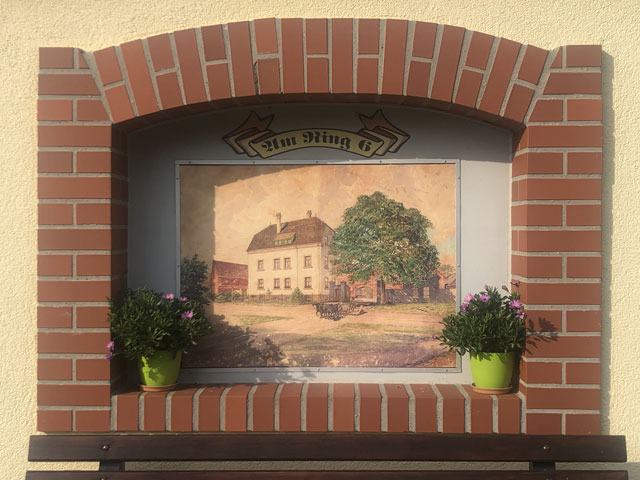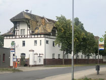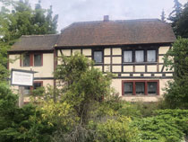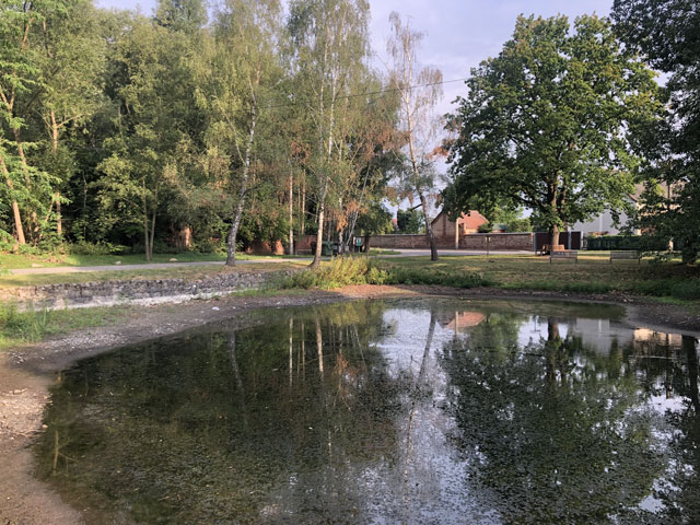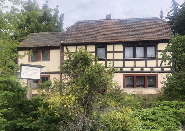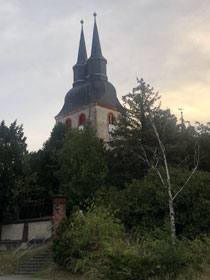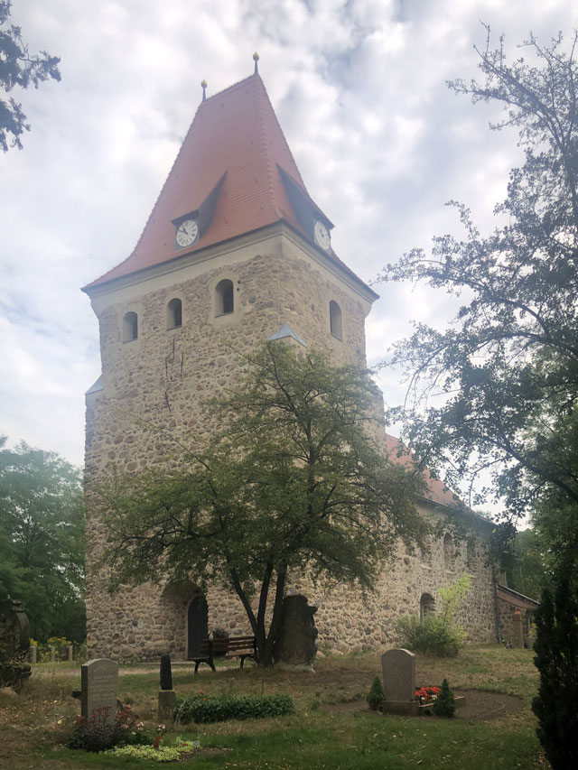 In Gottschena ist Gottvertrauen angebracht, oder wenigstens ein guter Schutzengel angesagt, denn die Straße windet sich ohne Fußweg und manchmal mit kaum Platz zum Gartenzaun durch den Ort oder besser um den Ortskern herum, denn das ist ein noch ziemlich ursprüngliches Rundlingsdorf mit einer kreisrunden Dorfstraße um den Anger mit Kirche und Dorfteich, die nur eine einzige Verbindung zur vorbeiführenden Landstraße hat. An der von einem Friedhof umgebenen Dorfkirche fand sich ein schönes, schattiges Plätzchen für eine Pause. Lästig war hier nur der Flugverkehr, den wir Mehrower ja nicht mehr gewohnt sind. Schkeuditz mit dem Flughafen Halle/Leipzig ist nicht weit und die Flieger sind hier schon so tief, dass manche bereits das Fahrwerk ausgeklappt haben. Während ich da saß, war jedes zweite Flugzeug ein rot-gelber Postflieger von DHL. In Halle/Leipzig hat ja DHL sein deutsches Drehkreuz.